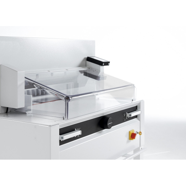 электрический привод ножа, оптическая индикация реза, металлическая крышка безопасности на задний стол, управление резом двумя руками, автоматический возврат ножа и прижима из любого положения, дисковый тормоз для мгновенной остановки ножа, регулировка глубины опускания ножа производится снаружи машины, легкая смена ножа с передней части машины