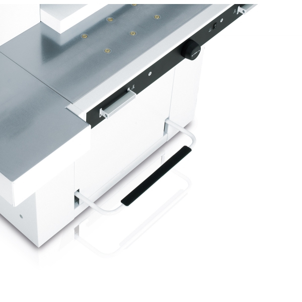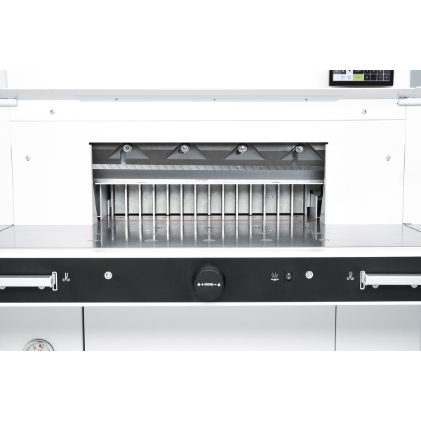 гидравлический привод прижима, гидравлический привод ножа, фотоблокировка, электронный контроль работы оператора двумя руками, автоматический возврат ножа и прижима из любого положения в исходное, регулировка глубины реза с внешней стороны машины, легкая замена ножа и марзана с передней стороны машины